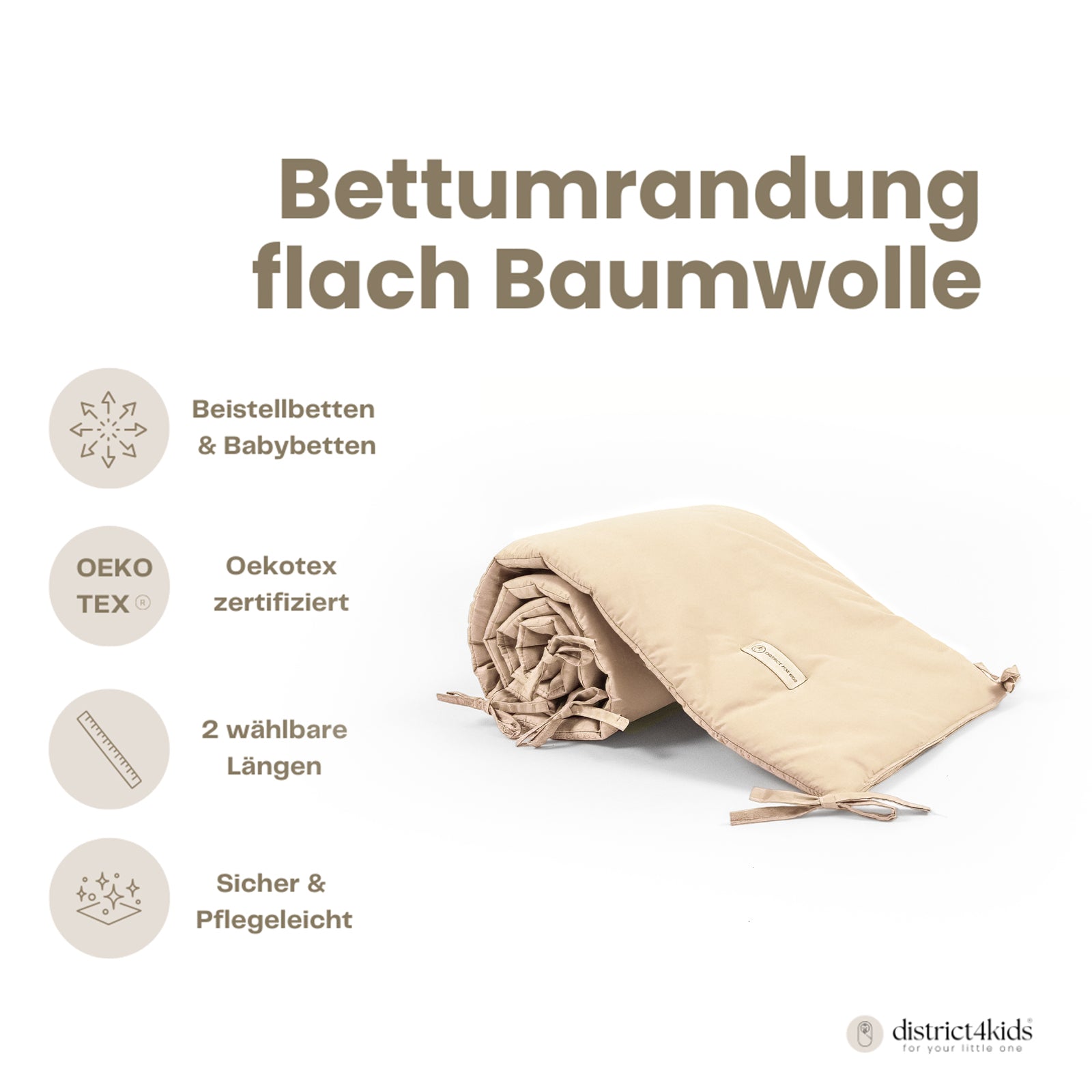 Suchst du eine Babybettumrandung für mehr Schutz und Geborgenheit? Bei District for Kids findest du flache Bettumrandungen sowie Bettschlangen (geflochten & einsträngig) in 180 cm und ca. 210 cm – passgenau fürs Babybett, Kinderbett und Hausbett. Weich gepolstert, formstabil und atmungsaktiv (z. B. OEKO-TEX®-Optionen), ideal gegen harte Gitterstäbe und Zugluft. Von Babyschlafexpert:innen empfohlen: für eine ruhige, sichere Schlafumgebung ohne lose Decken. Jetzt Babybettumrandung kaufen und entspanntere Nächte genießen.