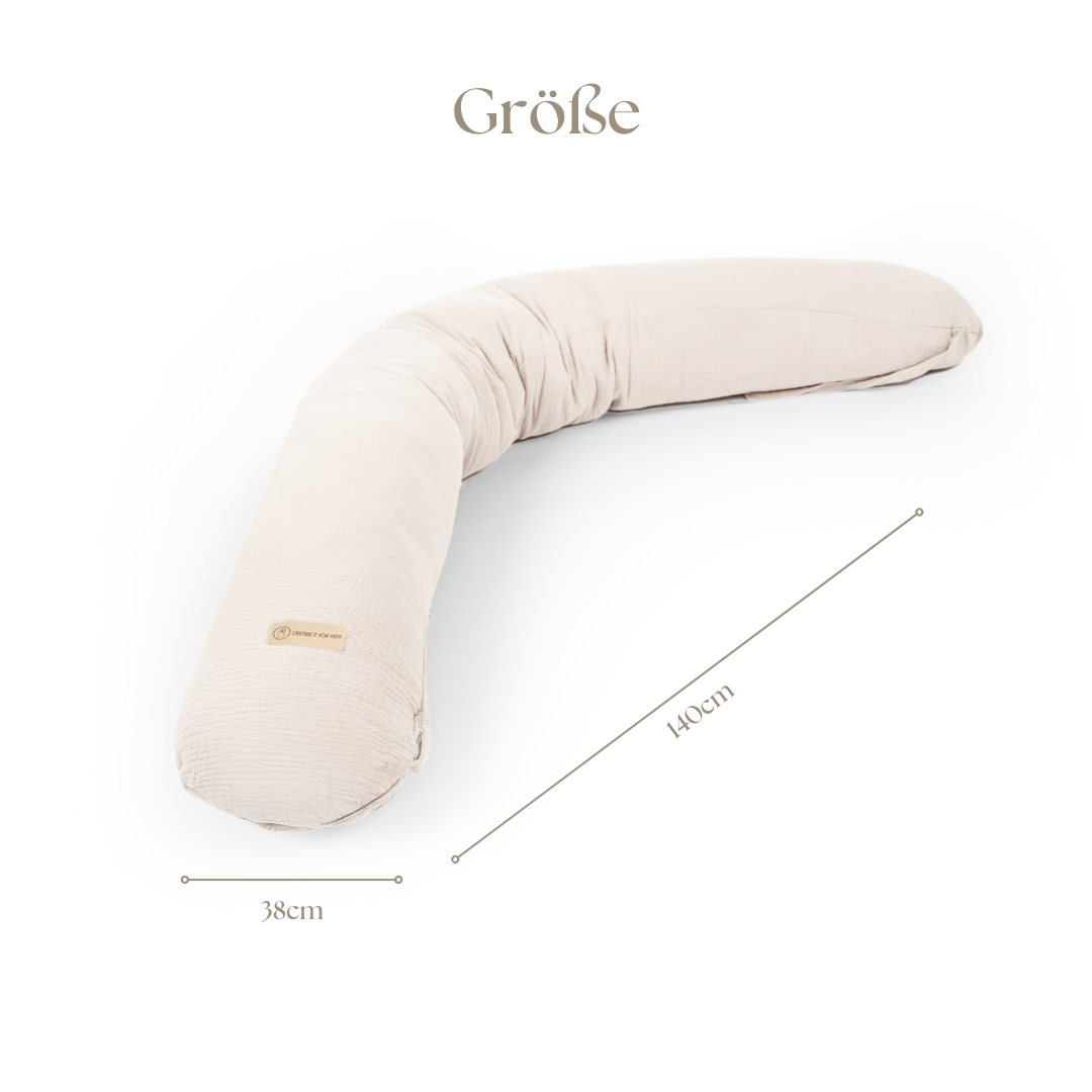 Das Rollen-Stillkissen ist besonders anpassungsfähig und lässt sich flexibel einsetzen. Mit Bändern fixiert, dient es als sicheres Nestchen für dein Baby oder als Begrenzung im Elternbett oder Babybett. Es passt sich jeder Situation an und wird so zum multifunktionalen Begleiter im Alltag mit Baby.