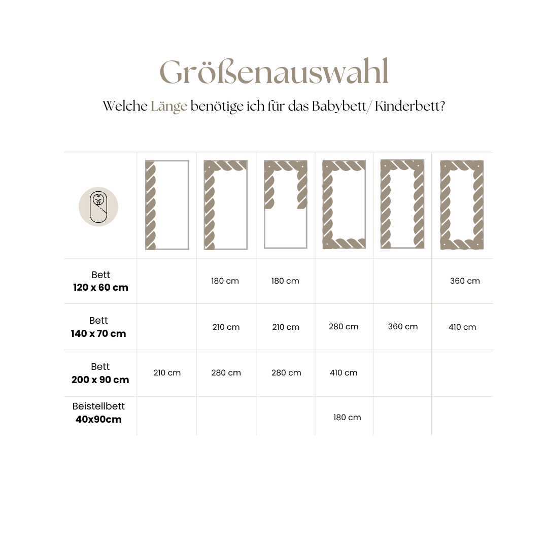 Dank der verschiedenen Längen der Bettschlangen, hast du viele Möglichkeiten, wie du sie im Bettchen platzieren kannst. In unserer Größentabelle findest du eine Übersicht der Möglichkeiten je nach Größe des Babybetts. Bitte beachte hier, dass du etwa 10 cm Spielraum in der Länge hast. Da unsere Bettschlangen aus hochwertigen, weichen Materialien gefertigt werden, kannst du sie etwas zusammendrücken.
