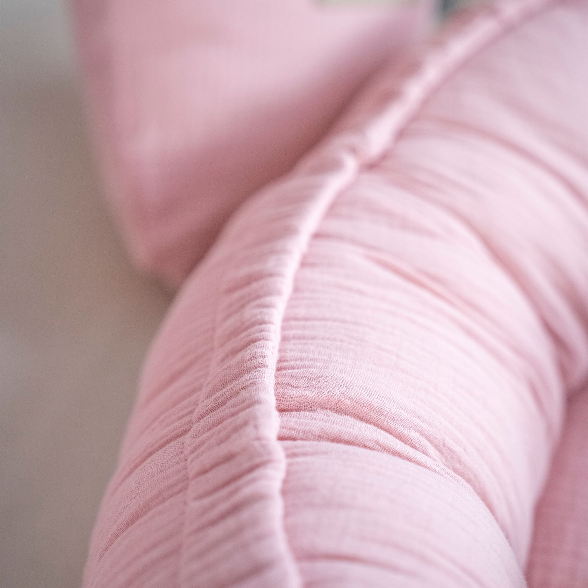 Der hochwertige Musselin-Stoff ist besonders weich, atmungsaktiv und hautfreundlich – perfekt für empfindliche Babyhaut. Die gleichmäßig gepolsterte Liegefläche sorgt für zusätzlichen Komfort und unterstützt eine ergonomische Liegeposition.