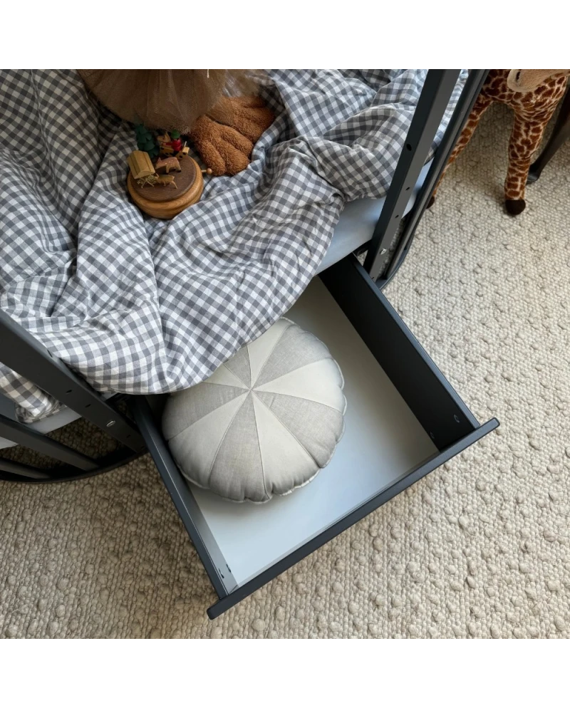 Nachdem du eine der Seitengitter des Kinderbetts entfernt und den Boden auf die gewünschte Höhe gesenkt hast, entsteht ein freier Raum unter der Matratze. Genau hier setzt die Schublade an: Sie füllt den Platz aus und verwandelt ihn in nützlichen Stauraum, ohne zusätzlichen Platz im Zimmer zu beanspruchen.