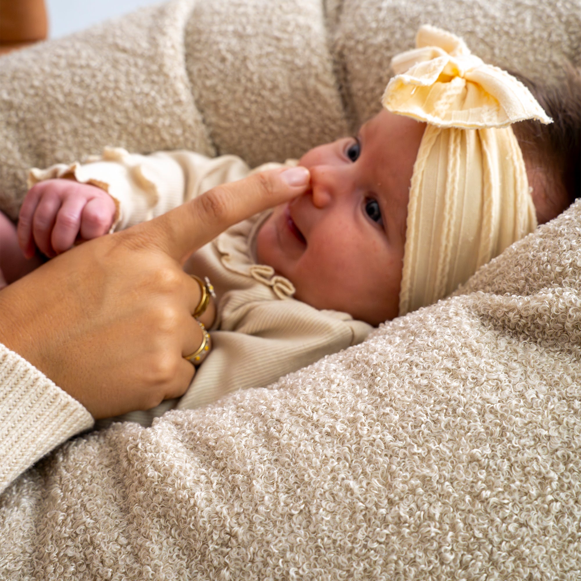 Mit seinem flauschigen Bouclé-Bezug, der weichen Füllung und der großzügigen Länge von 160 cm ist es ein echtes Wohlfühl-Accessoire – für erholsame Nächte, entspannte Stillmomente und kuschelige Stunden mit deinem Baby.