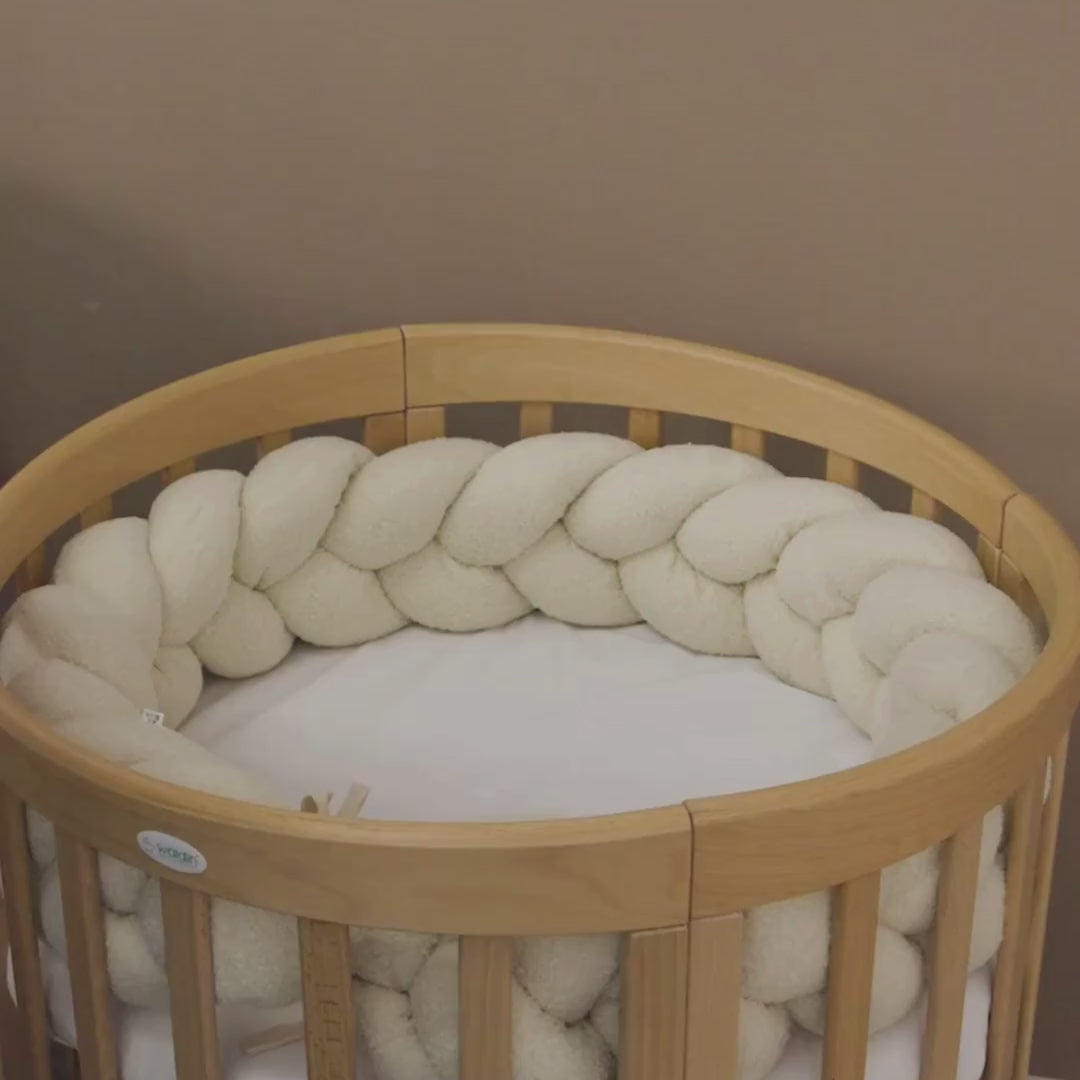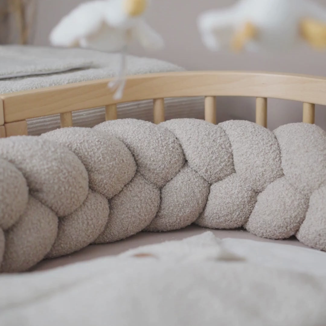 Die Bettschlange & Bettzopf aus Bouclé-Teddystoff von District4Kids schenkt deinem Baby Geborgenheit, Schutz & Komfort im Schlaf. Der weiche, geflochtene Bouclé-Stoff schützt zuverlässig vor harten Gitterstäben, Stößen und Zugluft – gleichzeitig sorgt die kuschelige Oberfläche für ein besonders gemütliches Schlaferlebnis.